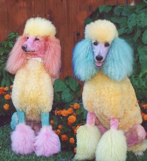 I wouldn't recommend dying your pups fur, but these two look like they are all dressed up for Spring and Easter Sunday. Cute but can be dangerous to the pet.