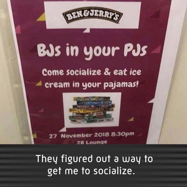 Ben and Jerry's in your pajamas. Come socialize and eat ice cream in your pajamas. What a great way to socialize!