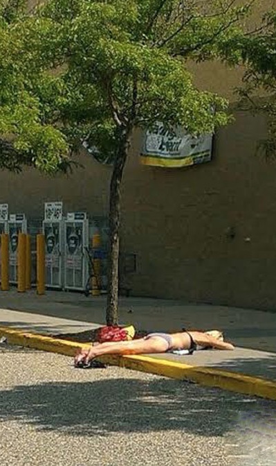 Damn that has to suck laying right next to trash and stepped on cigarette butts. I guess she must really want to tan badly either that or she's dead.