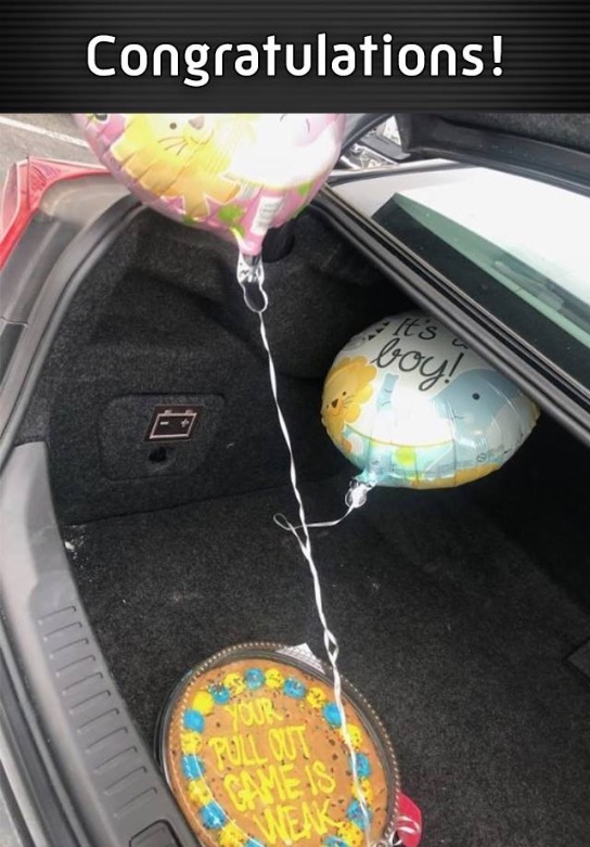 Congratulations it's a boy. Here are some balloons. Your pull out game is weak.