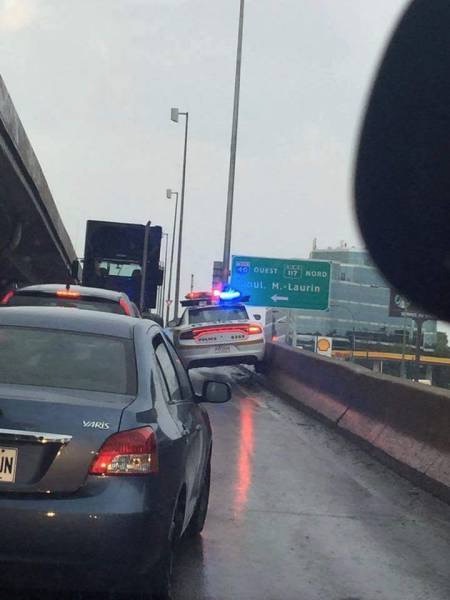 Looks like somebody has to give the police officer a ticket. I wonder if the car that has him pinned is going to get a ticket first?