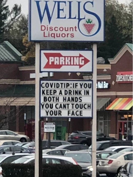 Covid Tip: If you keep a drink in both hands you can't touch your face.