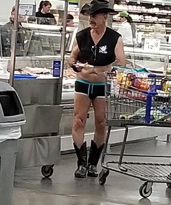 Cowboy boots in black and not much more than black. I think he's wearing briefs around the store.