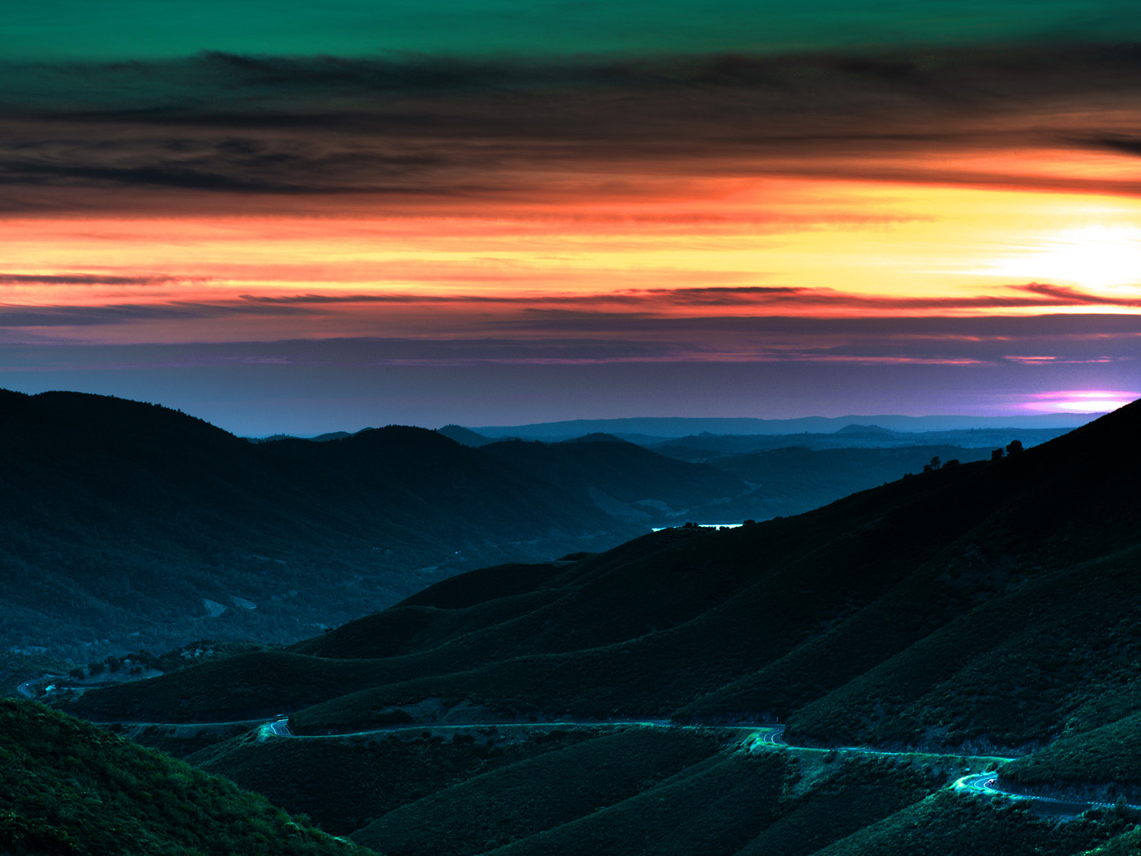 CRAZY sunset with multiple colors over a beautiful hillside. And then you notice the road swirling down.