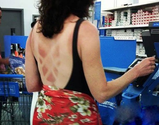 I hope this woman is buying some sunblock because those lines on her back look pretty bad. Looks like she might have been whipped or something. OUCH!