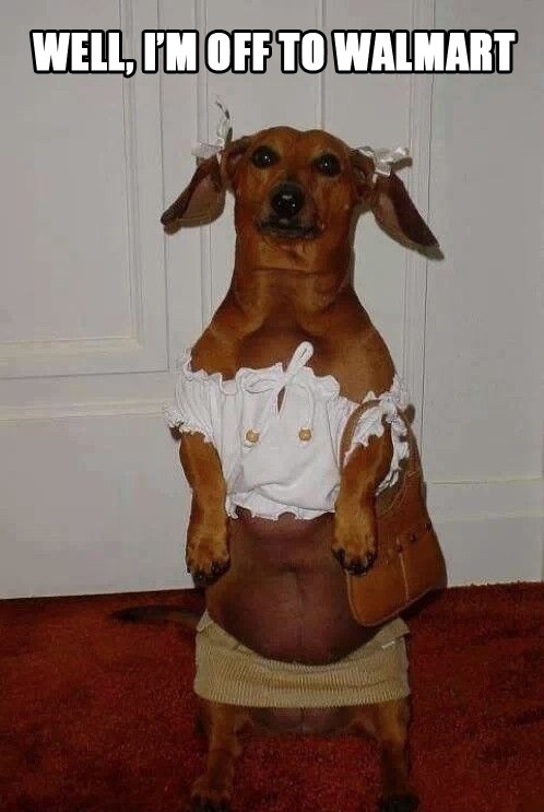 Well i'm off to walmart! This hotdog dog is all set to go shopping for the lowest prices. He's probably going to pick up dog treats and toys. He will fit right in at walmart.
