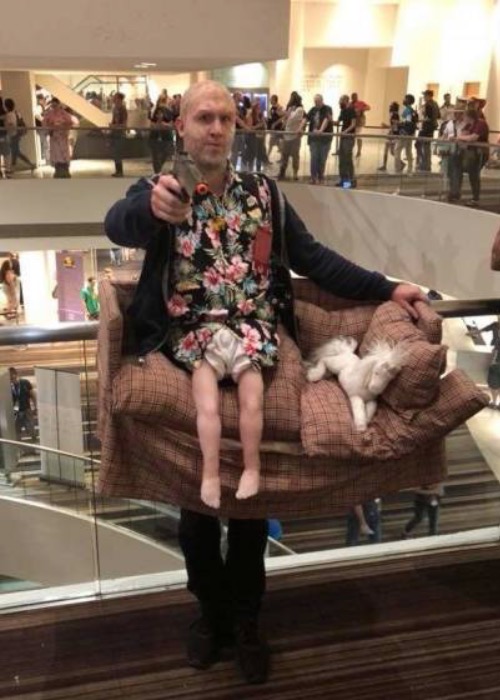 Daddy has long legs. They are so long they don't even touch the floor. I think his baby is hiding under his shirt.