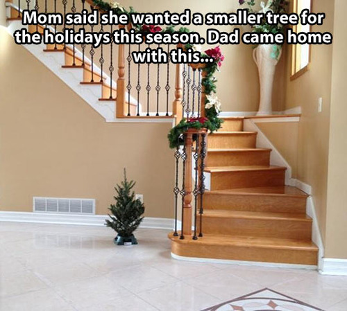 It is highly doubtful that this is what mother meant when she said she wanted a smaller tree. I bet that daddy is in trouble when mom finds out what he did.
