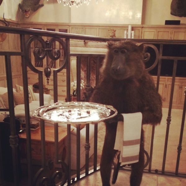 Who the heck gets a monkey to serve them food. This is a serious pet to have in your house.