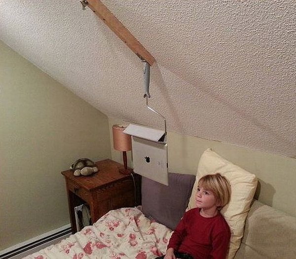 Ok now you don't have to buy one of those expensive accessories from the apple store. With a simple paint roller you can watch your favorite netflix movie in bed. Clever but stupid looking!