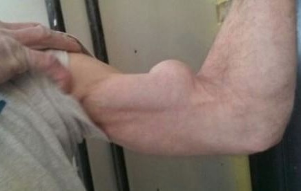What the heck is wrong with this guy's bicep? Does he have some weird medical condition that prevents him from growing a muscle larger than a bump? Weird.