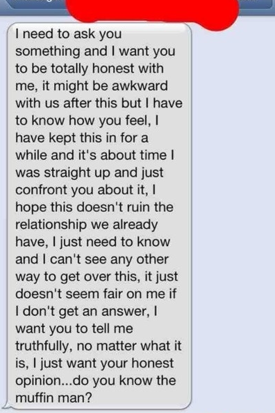 I need to ask you something and I want you to be totally honest with me, it might be awkward with us after this but I have to know how you feel, I have kept this in for a while and it's about time I was straight up and just confront you about it, I hope this doesn't ruin this relationship we already have, I just need to know and I can't see any other way to get over this, it just doesn't seem fair on me if i don't get an answer, I wont you to tell me truthfully, no matter waht it is i just want you honest opinion do you know the muffin man????