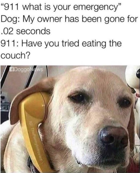 911: what is your emergency? Dog: My owner has been gone for 0.02 seconds. 911: Have you tried eating the couch?