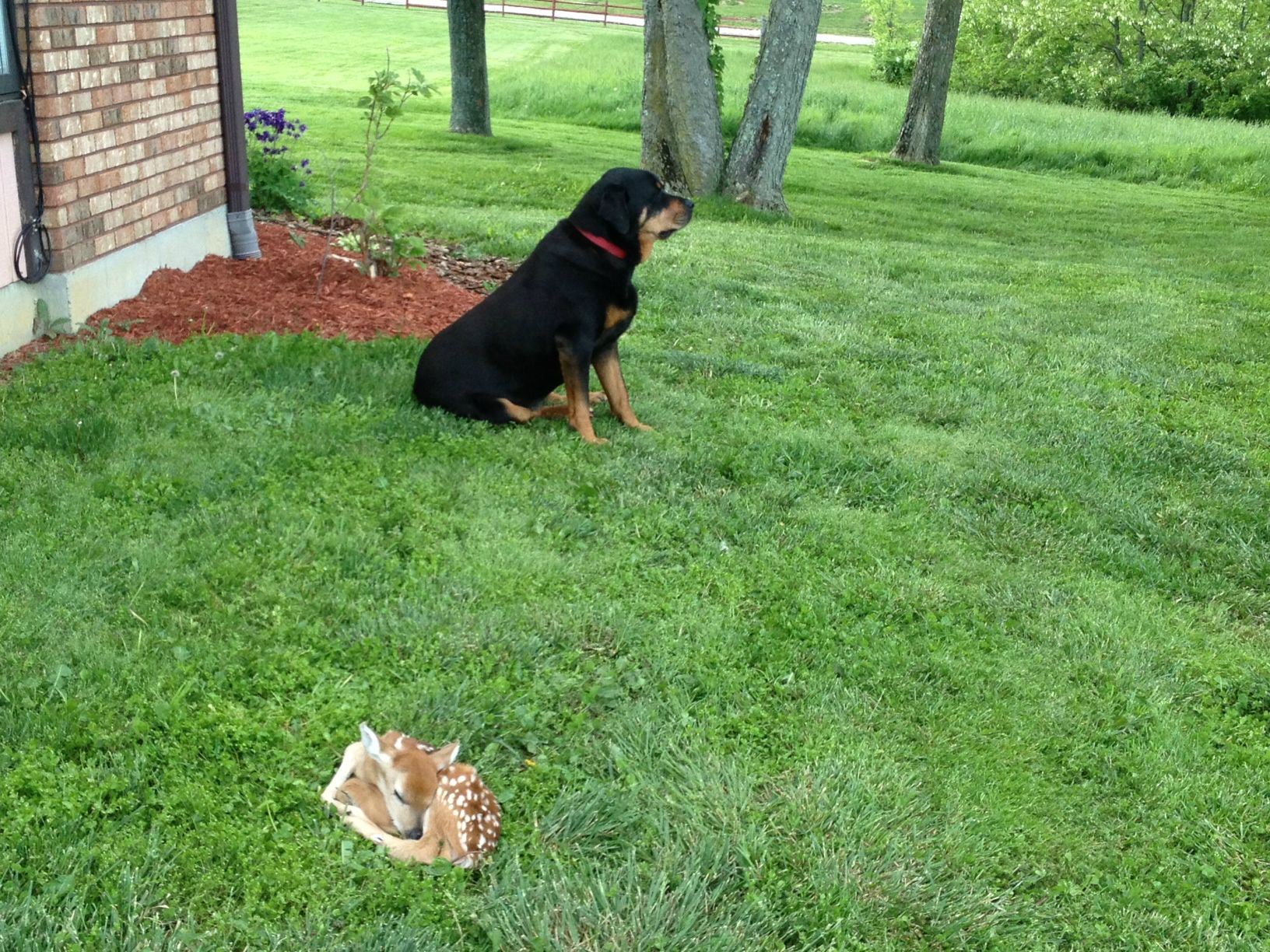 This Rottweiler is guarding this baby deer who was left alone by it's mother. I wouldn't want to mess with that little baby! What a good dog! Guarding Bambi!