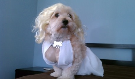 Dog is dressed like Marilyn Monroe and looks like a busty bombshell