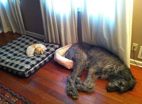 These two adorable dogs have switched beds. The little pup has a giant bed the big dog has a bed that only his butt fits into