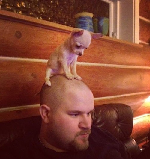 Look at my chihuahua balanced on my head! He looks like he's got a good grip on my bald head and is really enjoying the view. What a cute guy.