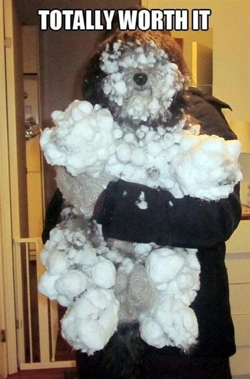 This has to be the most snow covered dog ever. This little guy must have had lots of fun! What the heck did he do bury himself in the snow?