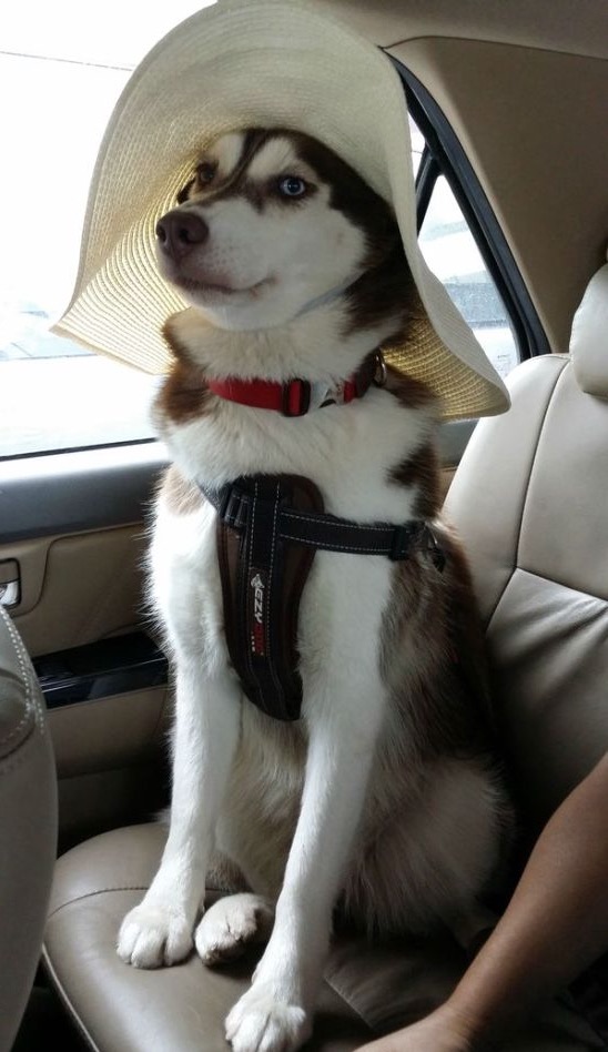 Alaskan Huskies need sun protection too! She would rather pull the car than ride in it though. She's so well behaved!