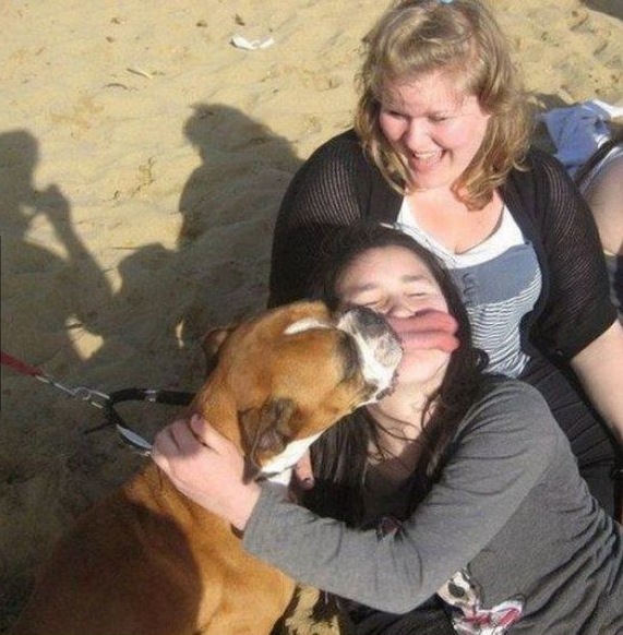 This cute boxer has a one very long tongue. Looks like he made a dog tongue duck face! That girl doesn't realize the amazing set of lips she has!