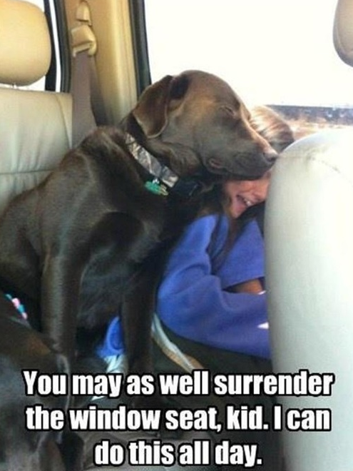You may as well surrender the window seat, KID. I can do this all day, said the dog.