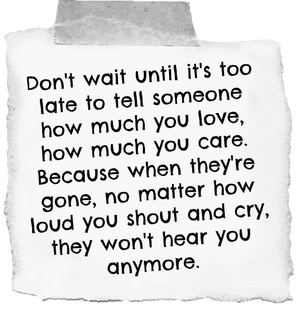 Don't wait until it's too late to tell someone how much you love, how much you care. Because when they're gone, no matter how loud you shout and cry, they won't hear you anymore.