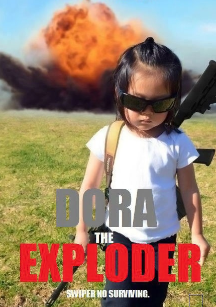 A picture of a girl looks like a cartoon character "Dora the Explorer" but in this case Dora is not the lovely kid that we know and love hear she is walking with AR-15 behind her back and walking away form the huge explosion that she just exploded something