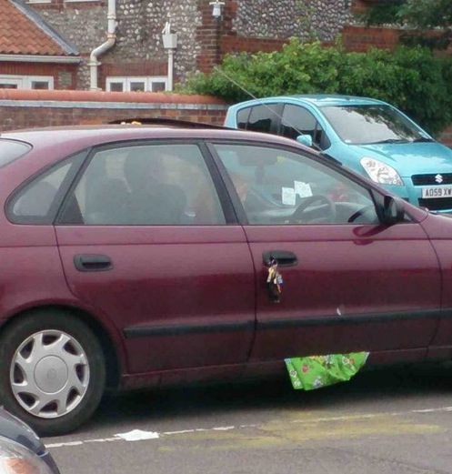 They must have really been in a rush because not only is her dress stuck in the car door but so are the keys. I wonder how long it will take for them to realize this?