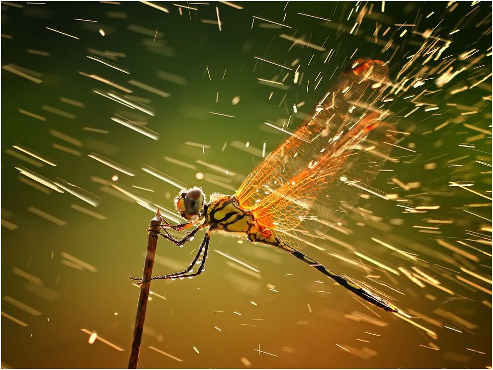 Arrows of rain seem to pelt a dragonfly in Indonesia's Riau Islands. To capture the photo, photographer Shikhei Goh took advantage of “superb lighting” and a friend spraying water on the dragonfly to simulate rain.