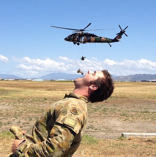 Helicopter hovers as rappelling soldiers go right into another soldiers mouth! interesting perspective