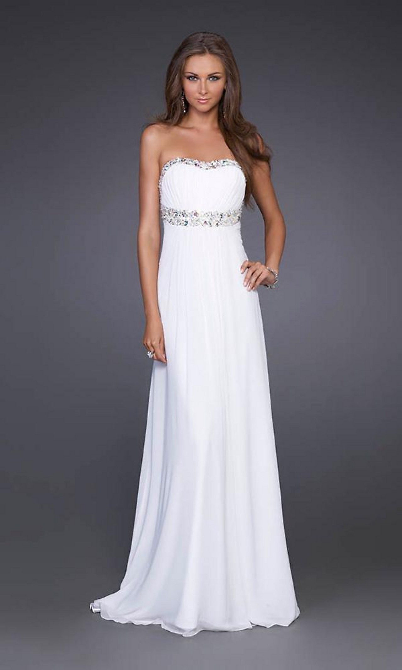 This La Femme designed prom dress is stunning in white. The strapless evening gown features a lightly gathered bust and flowing skirt. Beading trims the bust line and waist as well a the low cut back. This simply elegant evening dress is perfect for your next special event.