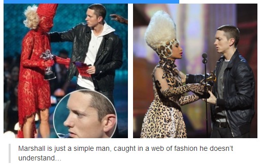 Marshall Mathers is just a simple man caught in a web of fashion he doesn't understand. Looks like he vomited some of that spaghetti sauce on Lady Gaga... And then he went home and wrote Not Afraid...