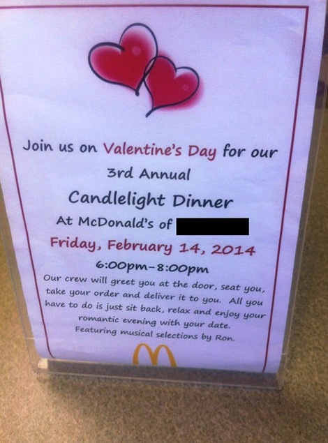 Wow I couldn't think of anything more romantic than taking my woman to mcdonald's for valentine's day. We really love the ambiance.