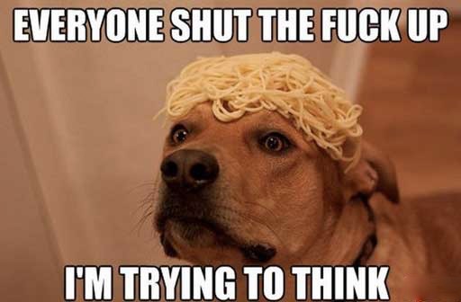 Everyone shut up...I'm trying to think. It's not easy with this bowl of spaghetti on my head.