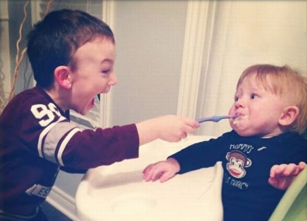 The poor little guy's face is priceless. Look at the look on his face. He's about to burst into tears. I don't want to brush my teeth!