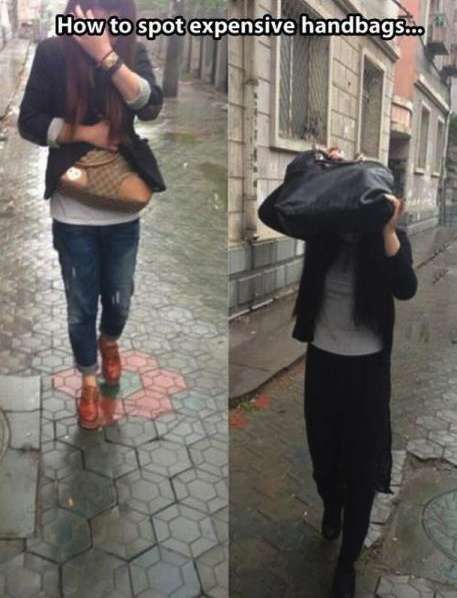 The ultimate test for whether or not your handbag is expensive. If it's too fancy to be soaked by the rain, then it must be expensive.