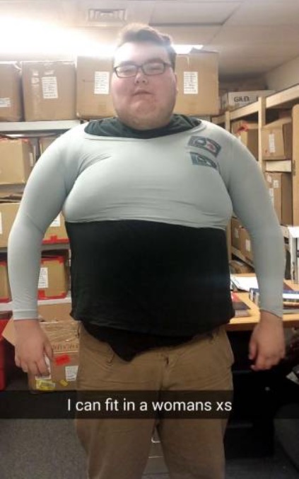 It looks like these women's tops fit guys too. This guy fits this top like a glove: a really tight glove!