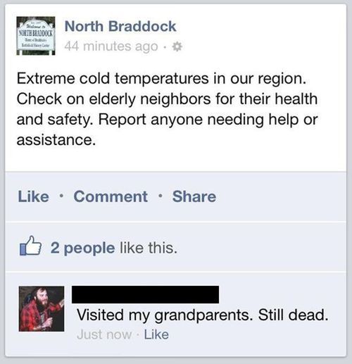 Facebook status update reads: Extreme cold temperatures in our region. Check on elderly neighbors for their health and safety. Report anyone needing help or assistance. Comment: Visited my grandparents. Still dead.