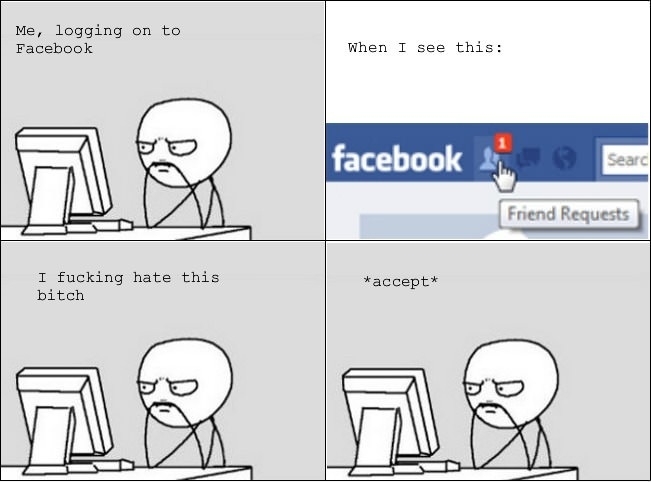When I set behind the computer when I have a free min I log into facebook account and look at my notifications, someone sent me a friend request, Man I hate this bitch but I still ACCEPT