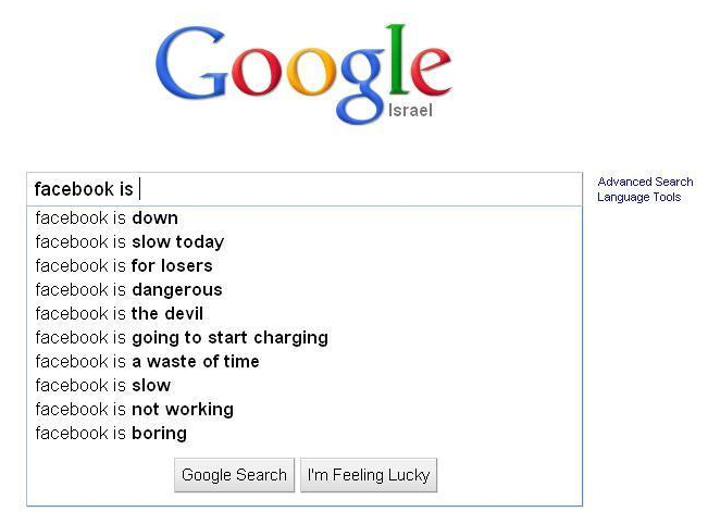 If you have any free time and you want to spend it laughing, go to Google and type in "Facebook is" and see what autocomplete it will give you