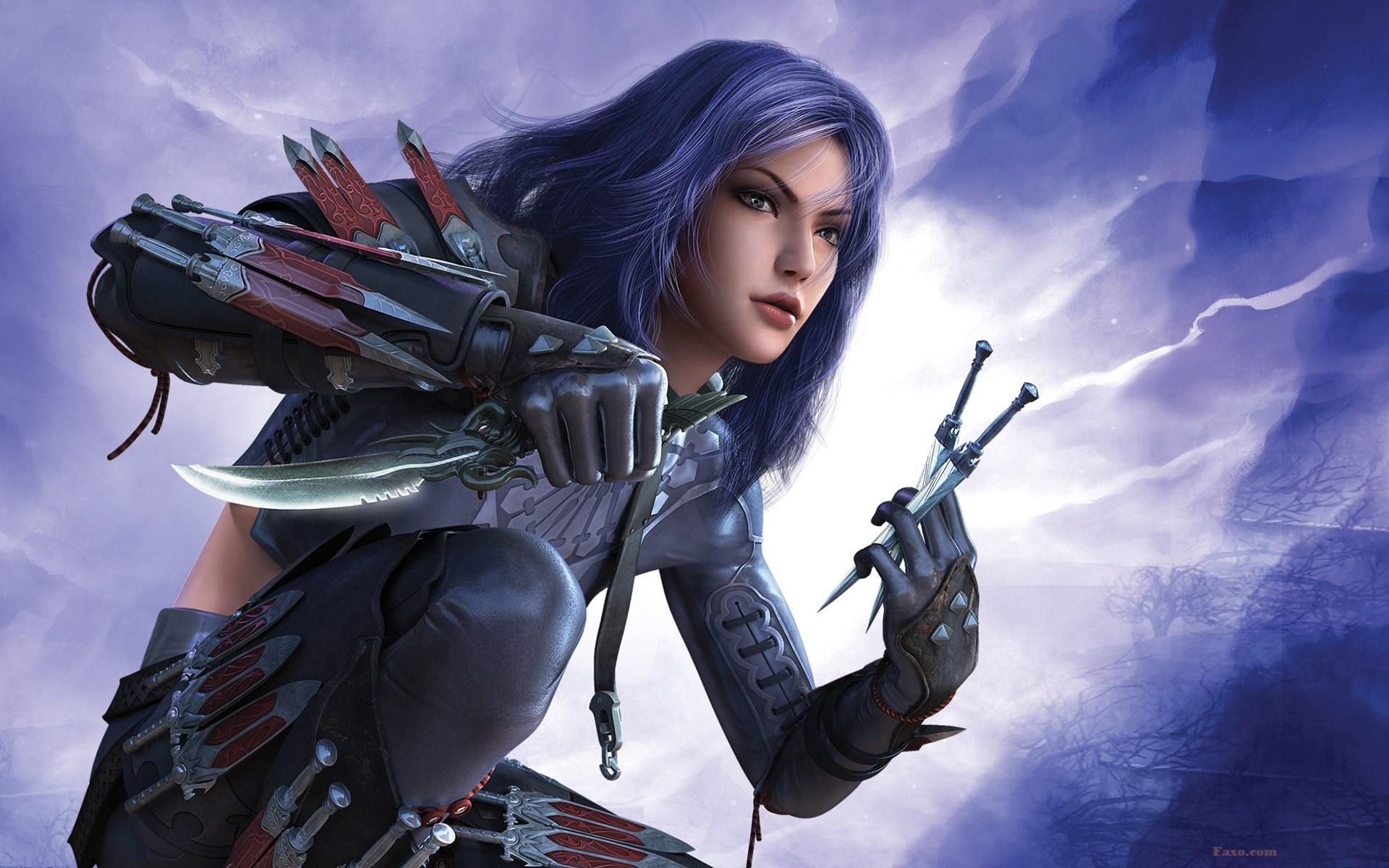 Assassin cartoon girl with purple hare she assassinates people with knifes. The shot is taken when she is setting one one knee and holding knifes.