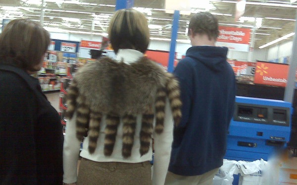 This here looks like Davy Crockett's wife. That sure is a lot of raccoon tails she is wearing. Looks like she took out the whole family. I'm surprised she's not wearing one on her head.