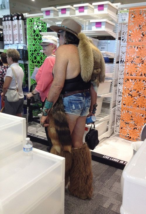 If you are in the market for raccoon tails or fluffies for your feet look no further than Walmart. Be sure to wear some nice shorts and a tank top too. Don't forget the hat!