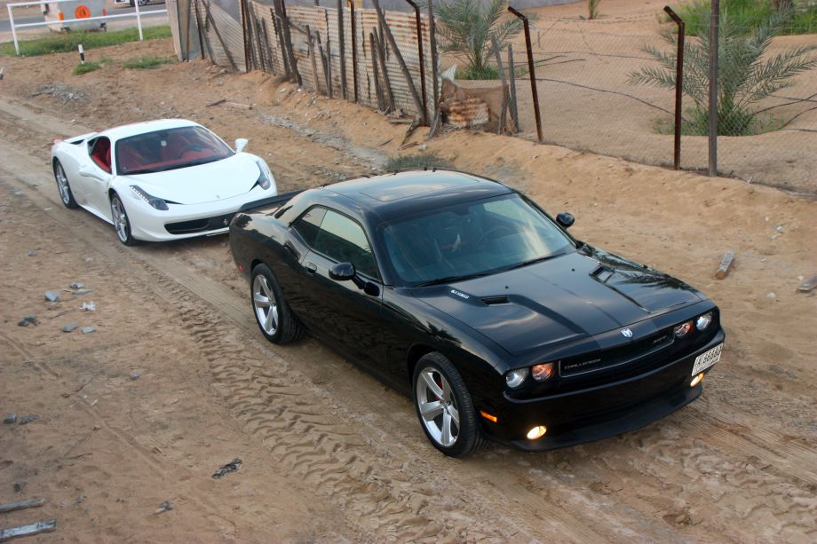 Beautiful white Ferrari 458 Italia with a black Dodge Challenger standing in front of it and both parked somewhere off on a dirt road probably on a construction site.