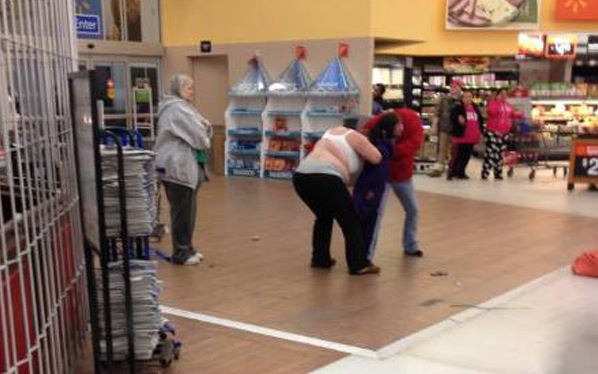 There is a fight at Walmart and you knew somebody was bound to lose their shirt. Well here you go. No shirt and her bra is showing right in the middle of walmart. Nobody notices.