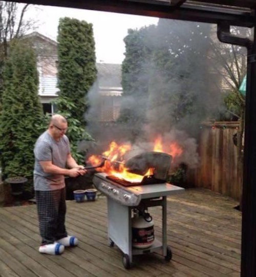 This guy is going to need treatment for 3rd degree burns. Those flames are so high he might catch on fire. Looks like he already burned his feet!