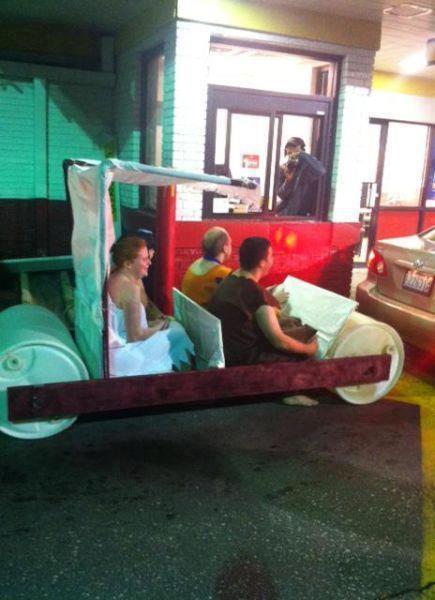 It looks like Fred, Wilma, Barney, and Betty are back in town at a real drive thru getting some fast food. Hilarious recreation of the original cartoon complete with foot driven automobile.