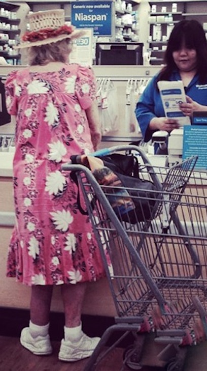 Looks like driving miss daisy shops at Walmart. She even has her running sneakers on. If you look at the checkout person I could swear she is smirking