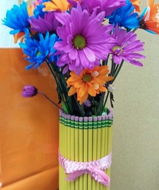 If you are making a vase, hot glue pencils all the way around a glass jar that is fairly tall and cylindrical. If you are making a pencil holder, a can will work perfectly. Tie a pretty ribbon around it, and you have a wonderful gift for a teacher, mom's or dad's desks, or friends.