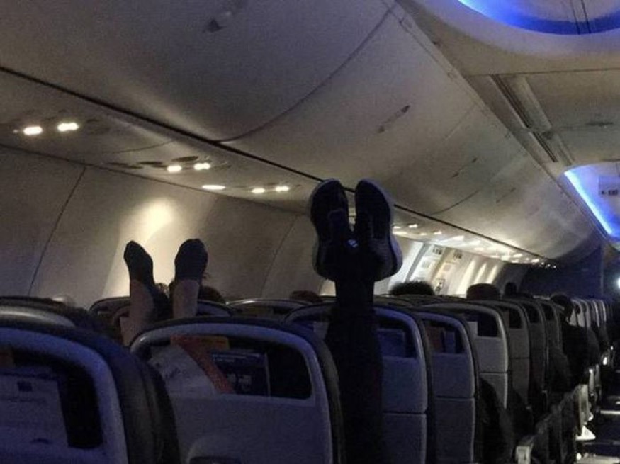 No more space left in your seats so the airlines are now offering flying foot rests. Just stick your legs straight up in the air.